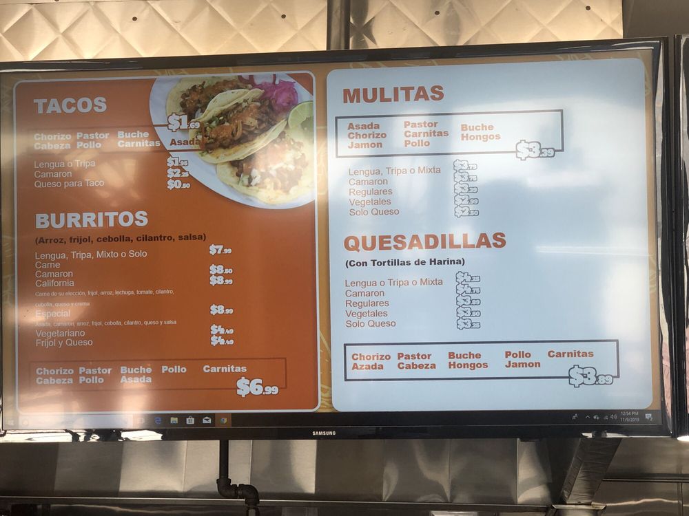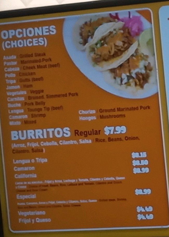 Asada, camaron, arroz, frijol, cebolla, cilantro, queso y salsa